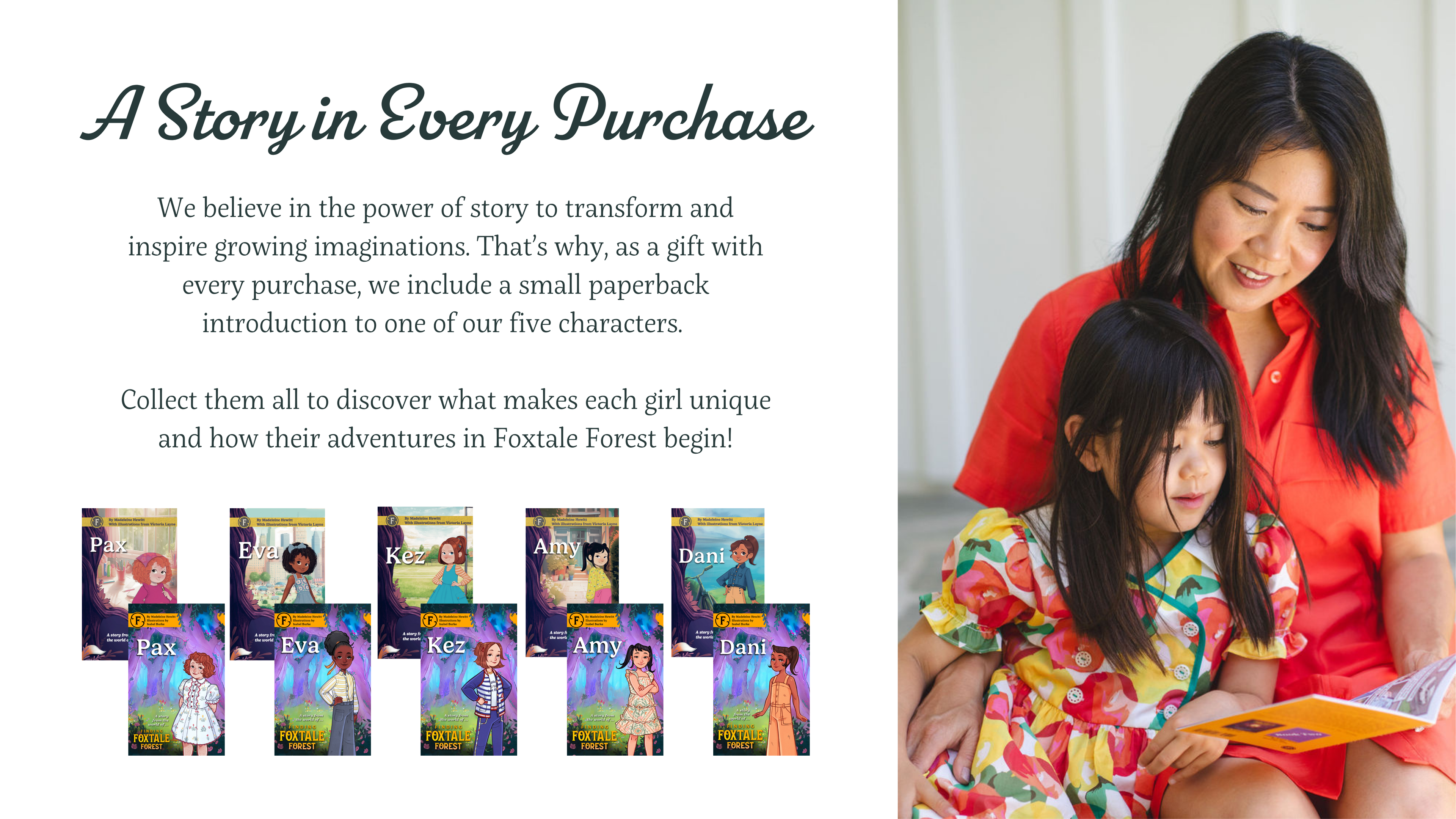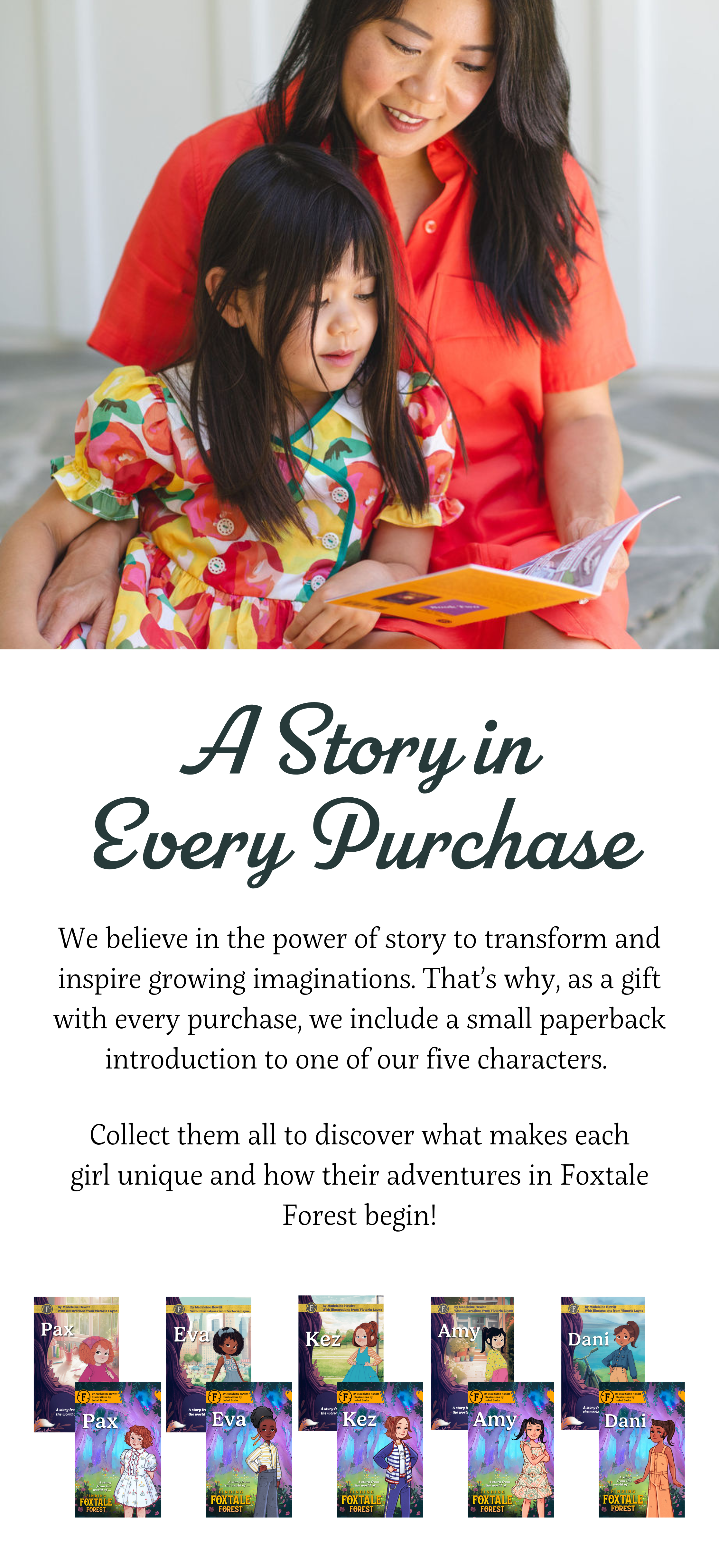 We believe in the power of story to transform and inspire growing imaginations. That's why, as a gift with every purchase, we include a small paperback introduction to one of our five characters.