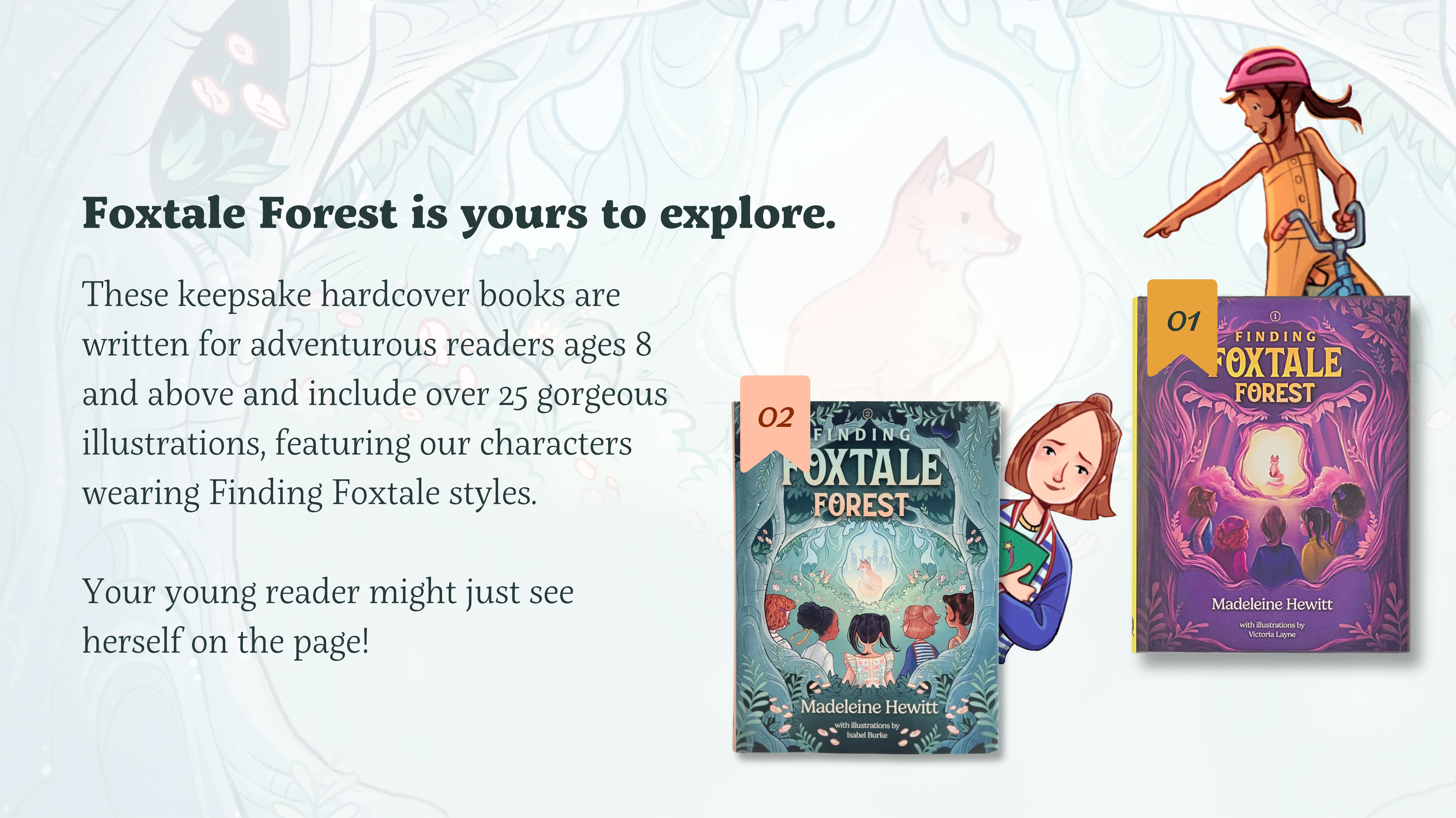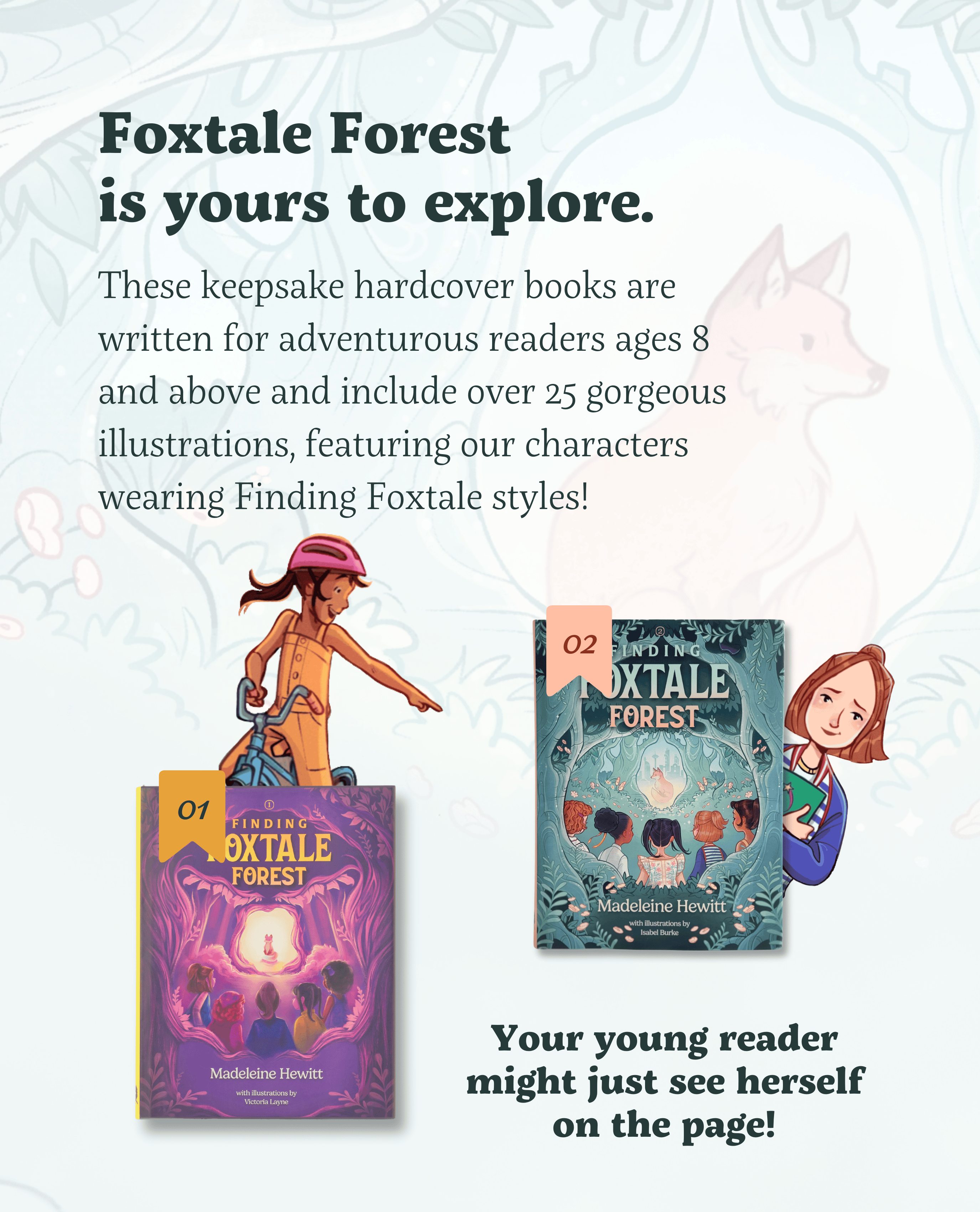 These keepsake hardcover books are written for adventerous readers ages 8 and above and include over 25 gorgeous illustrations, featuring our characters wearing Finding Foxtale styles.