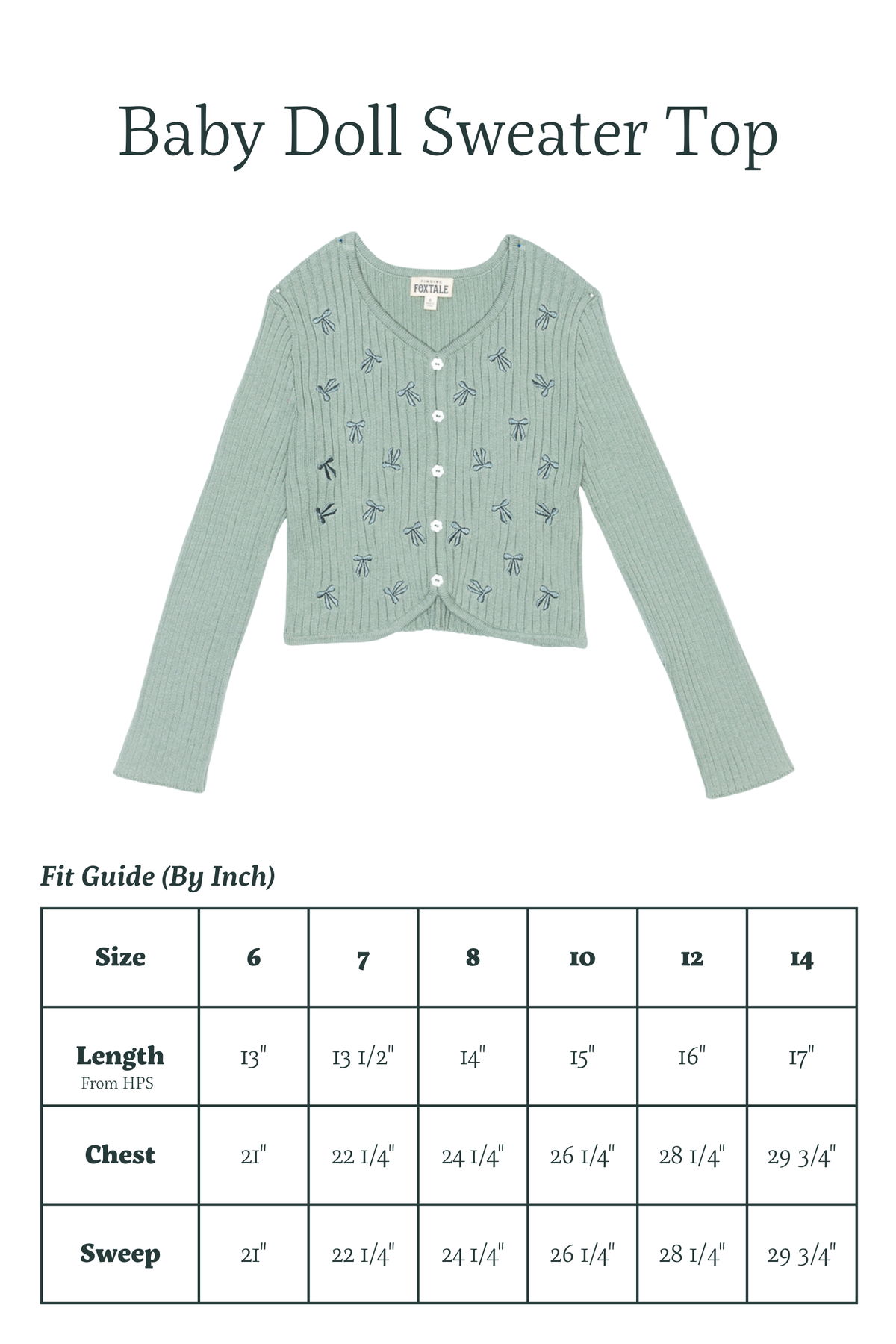 Soft knit, subtle charm. This ribbed sweater style is sprinkled with delicate bow embroidery and topped with feminine flower buttons. It’s cut in a slightly cropped, easy shape that’s made for layering or effortlessly wearing on its own. The V-neckline keeps it classic, while the fit feels modern and cool—perfect for the girl who likes her sweet with a side of trend.