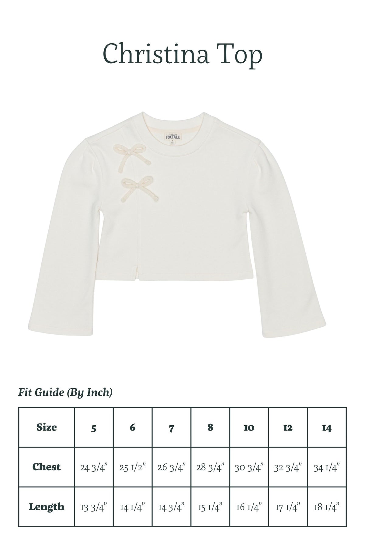 Cool, comfy, and quietly confident. The Christina Top is made from soft French Terry in a crisp off-white color and finished with coquette-inspired yarn bows and pleated sleeves for a touch of structure. The semi-cropped length pairs perfectly with high-waisted bottoms, like our Out of Africa Bottoms, for a look that’s both sweet and self-assured.