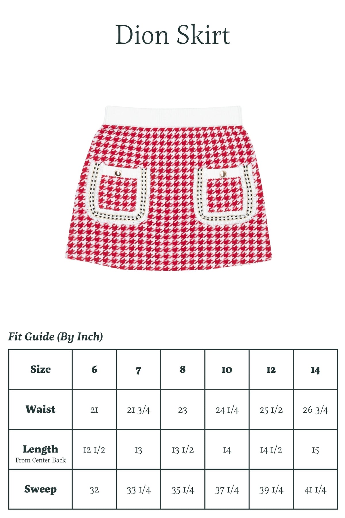 For the girl who loves a classic set with a modern edge, the Dion Skirt is the definition of polished prep. Its rich red and white herringbone knit feels instantly iconic, framed with plush chenille trim and finished with gold shank buttons for a hint of shine. With an easy elastic waist and a timeless silhouette, it’s effortlessly chic on its own — and even better with the matching Cher Cardigan.