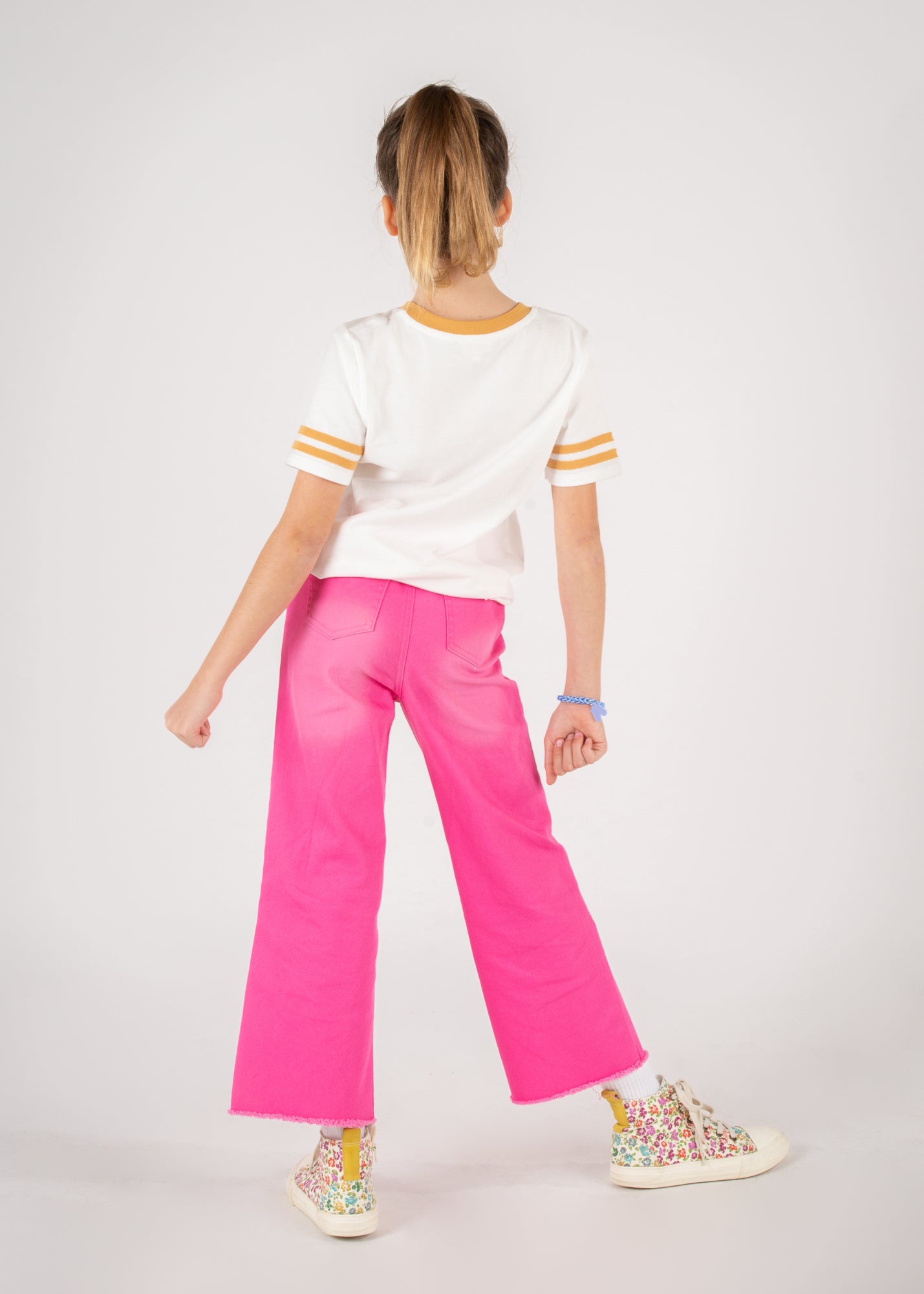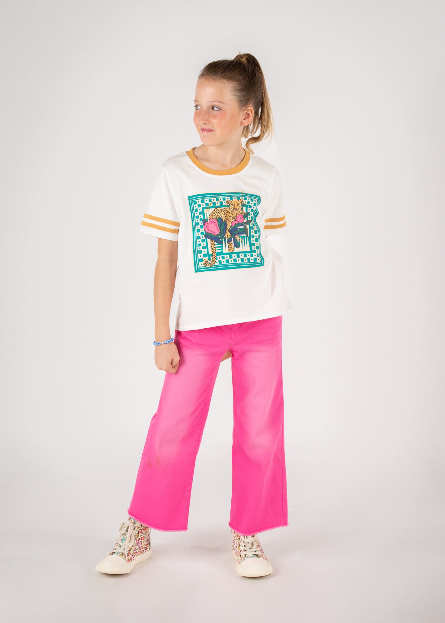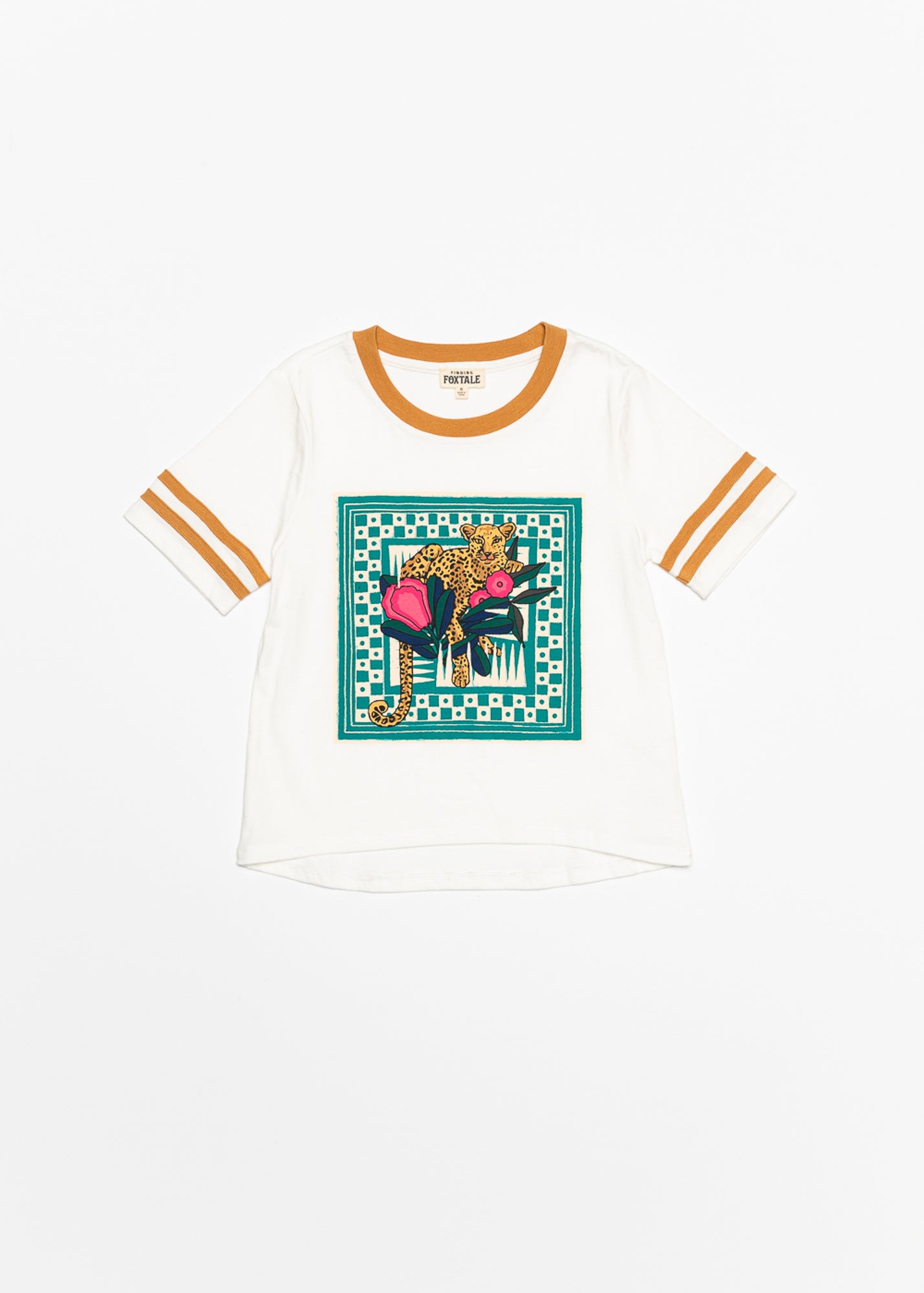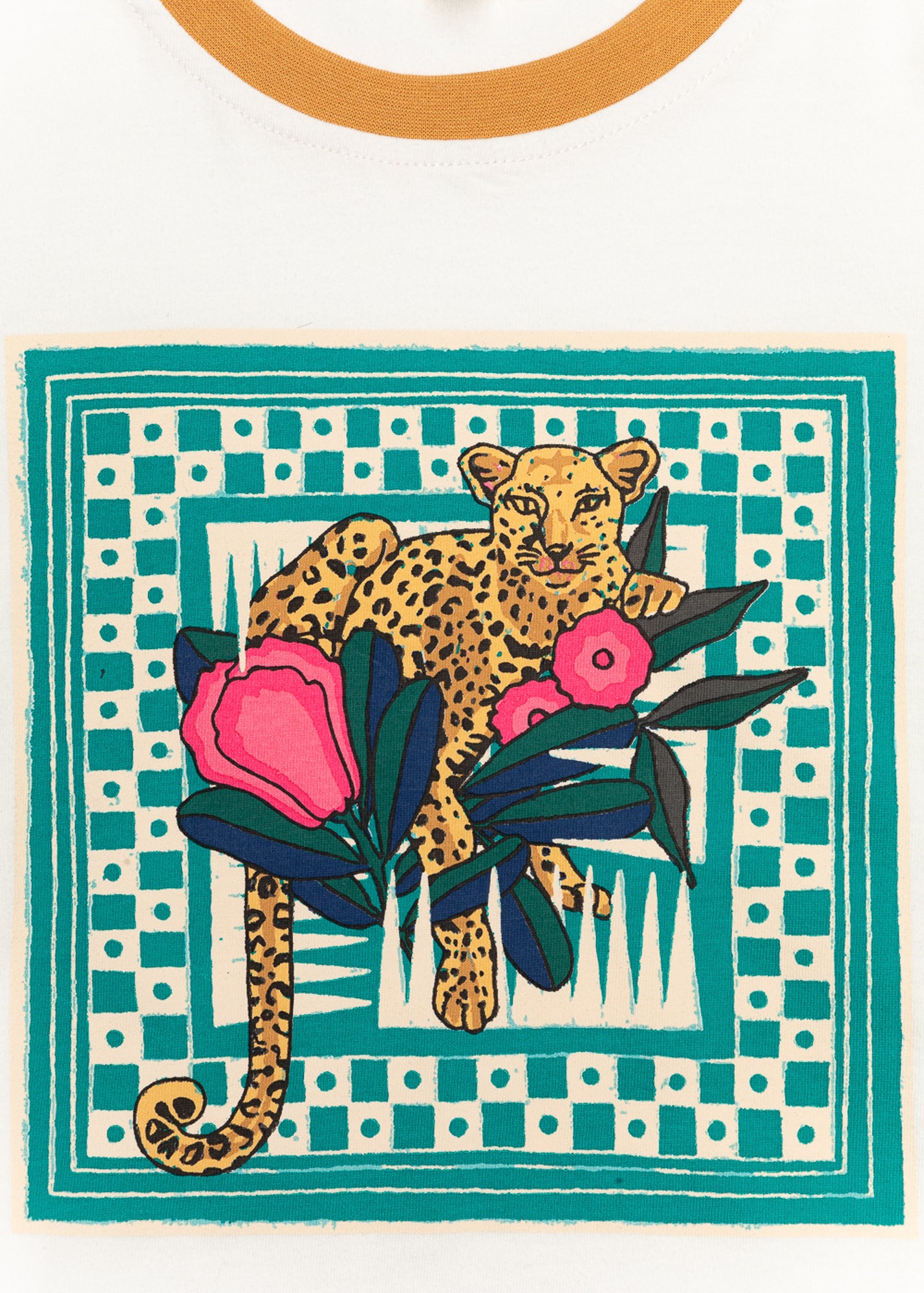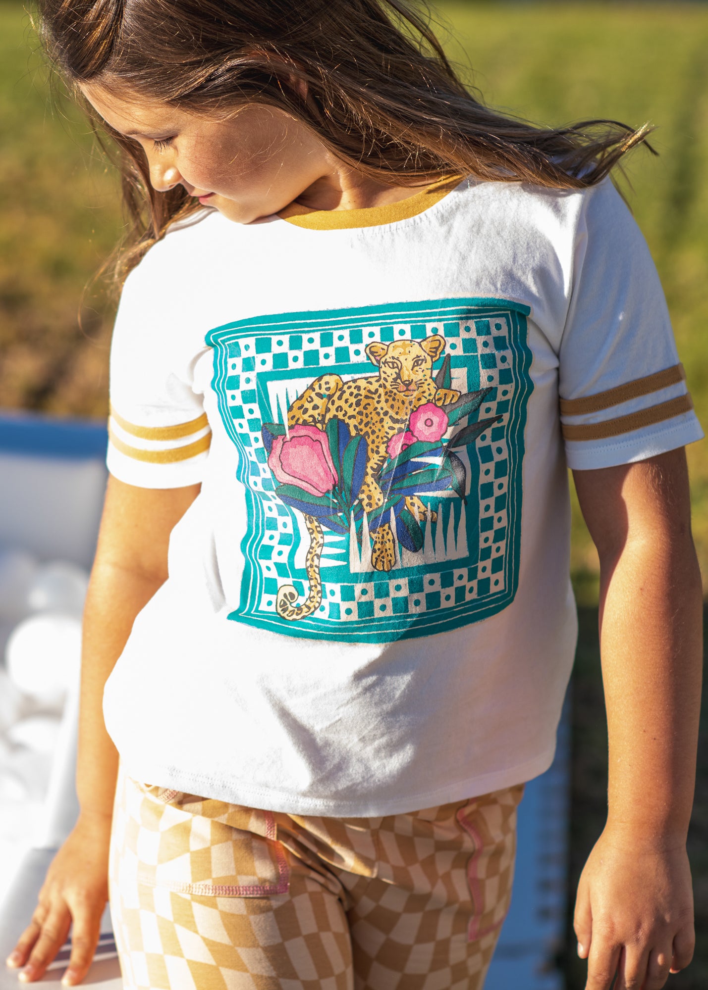It’s a fashion jungle out there! Be prepared for whatever trend is lurking around the corner in the Into the Wild Tee. This cotton T-shirt makes a roaring statement with a custom graphic, the lovely leopardess, and sporty-feeling stripes on the sleeves. Be one with nature and add the Cotton Candy Pants or the Toffee Sweatpants for a fiercely fabulous ’fit.