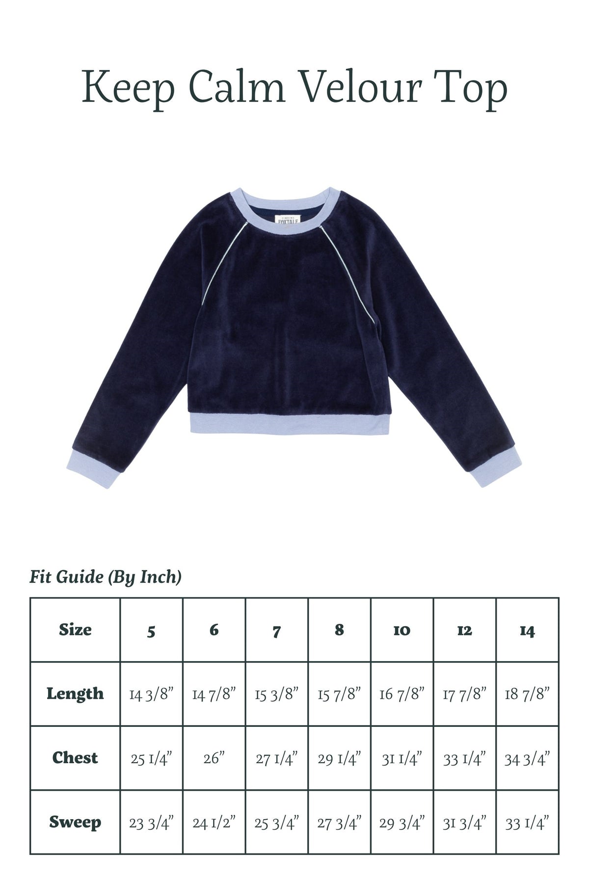 For the girl who embraces comfort without giving up style. The Keep Calm Velour Top is made from ultra-soft navy velour fabric and finished with pale contrast piping and raglan sleeves for a refined sporty feel. Pair it with the matching Carry On Velour Bottoms for a head-to-toe look that’s relaxed, pulled-together, and effortlessly chic.