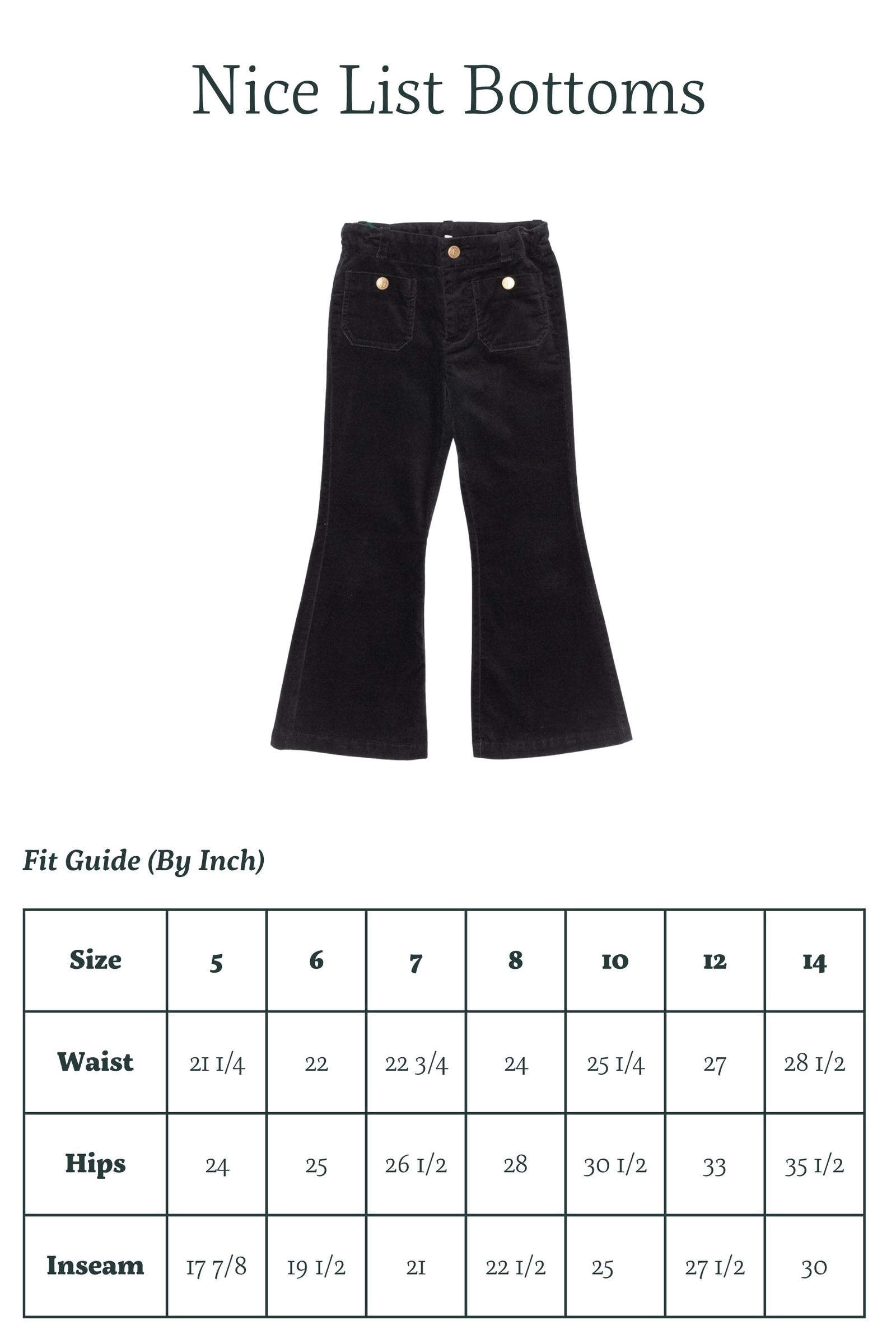 Introducing a little luxury for her holiday lineup. The Nice List Bottoms are crafted from rich black velveteen that catches the light with every move. Gold snaps at the waist and pockets add just the right touch of shine, while a subtle kick flare silhouette brings modern polish. Designed with comfort in mind, the adjustable interior waistband ensures the perfect fit — because being on the nice list should feel as good as it looks.