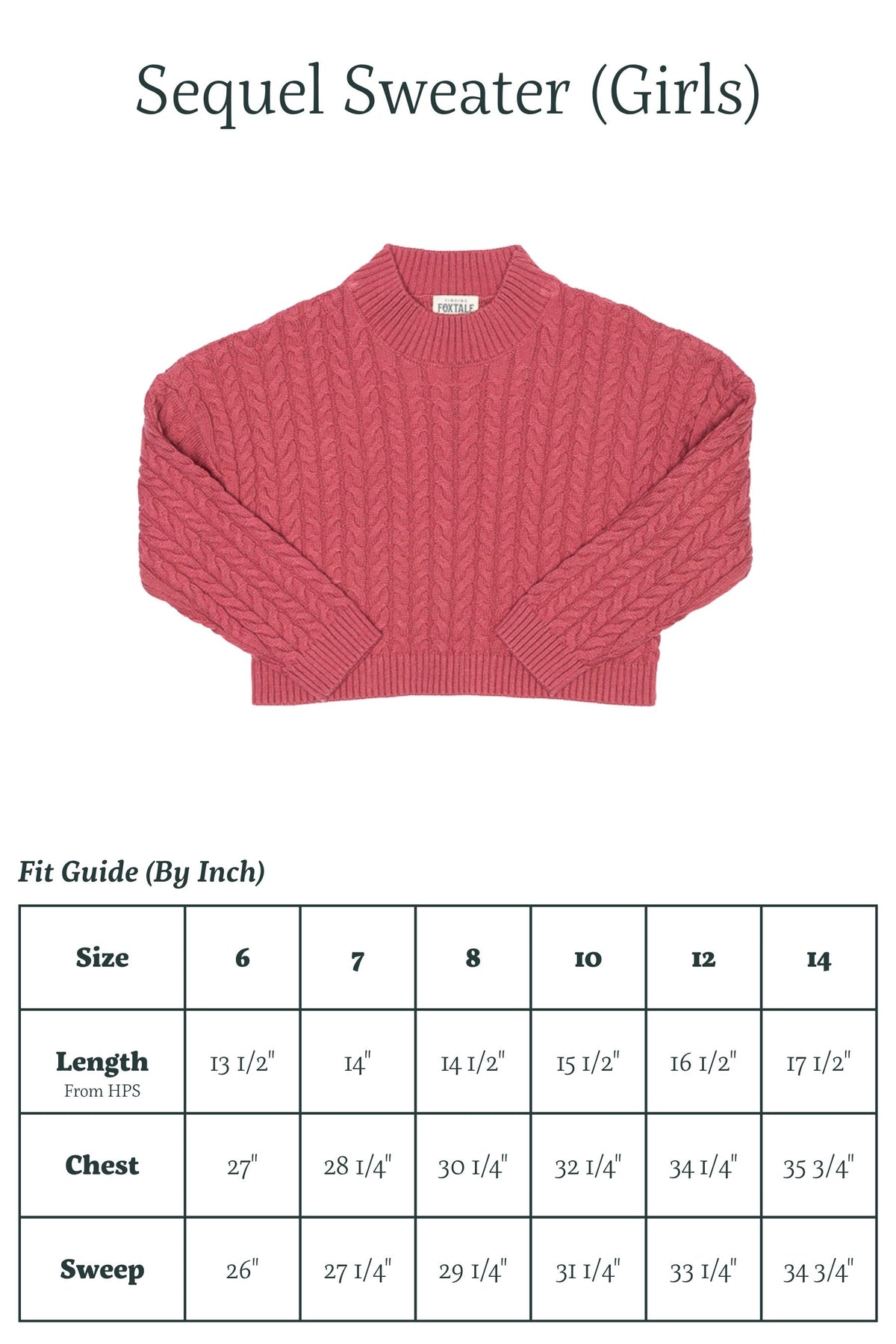 Wrap yourself in cozy elegance with the Sequel Sweater. This faded rose cable-knit design features relaxed drop shoulders for a comfy fit and pairs perfectly with the Bookmark Bottoms 2.0 or can easily be mixed with the Patchy Pants or Odette Skirt. Equal parts comfy, cool, and classic - the Sequel Sweater makes getting ready for any occasion a cinch.